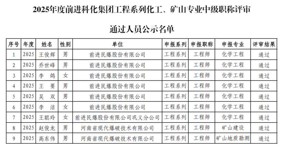 關于2025年度河南省前進化工科技集團股份有限公司工程系列化工、礦山專業中級職稱評審通過人員的公示